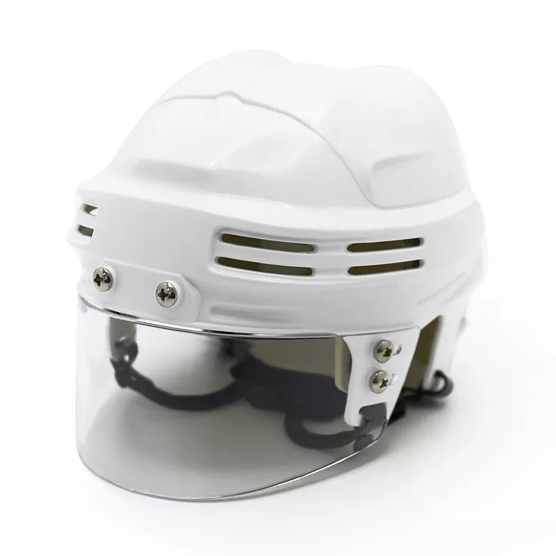 De mini-ijshockeyhelm is een verkleinde versie van een standaard ijshockeyhelm, ontworpen om tentoon te stellen of als nieuwtje. Het heeft doorgaans dezelfde ontwerpelementen als een full-size helm, inclusief een harde buitenschaal, beschermende vulling en een kinband. De helm kan ook teamlogo's of kleuren bevatten die een specifiek hockeyteam vertegenwoordigen. Hoewel niet bedoeld voor daadwerkelijk gebruik in de gameplay, dient de mini-ijshockeyhelm als een leuk verzamelobject voor fans van de sport.